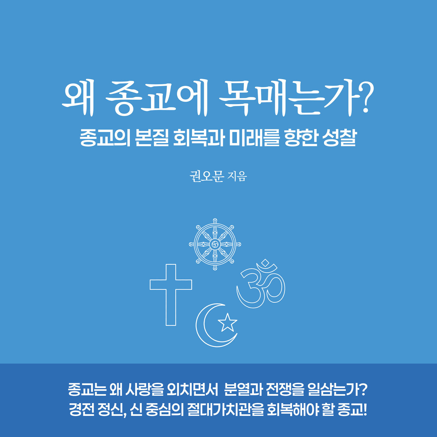 《왜 종교에 목을 매는가?》(권오문 지음, 울림과세움 발행)는 절대다수의 인류가 믿고 있는 종교가 왜 길을 잃고, 본연의 모습에서 이탈하게 됐는지 구체적으로 탐구하면서 종교의 본질 회복을 위한 방안을 구체적으로 살펴보고 있다. 아울러 이 책은 ‘종교의 본질 회복과 미래를 향한 성찰’이라는 부제가 말하듯이 오늘날 벼랑 끝에 내몰린 종교계가 안고 있는 기복화와 세속화, 파벌주의, 비전 상실 등 종교 현안과 정면으로 마주하면서 그 대안을 모색하고, 격변기를 맞이한 종교의 미래에 대해 집중 탐구하고 있다. 이는 오랜 역사를 거쳐 오면서 두꺼워진 위선과 탐욕의 그림자를 과감히 거둬내어 종교 본연의 모습을 되찾기 위한 성찰의 과정이자, 신이 떠난 종교, 신이 함께할 수 없는 종교로 추락한 암담한 현실을 극복하려는 진실한 종교인들의 몸부림을 반영한 것이라고 저자는 밝히고 있다. 이 책은 종교의 근원인 신의 참모습을 밝히고, 위대한 성인들의 정신을 회복함으로써 전대미문의 격변기를 헤쳐 나가야 할 종교의 존재 이유를 다시 찾고, 참된 신앙 길을 갈망하는 종교인들의 염원에 응답하고자 기획했다고 설명했다.